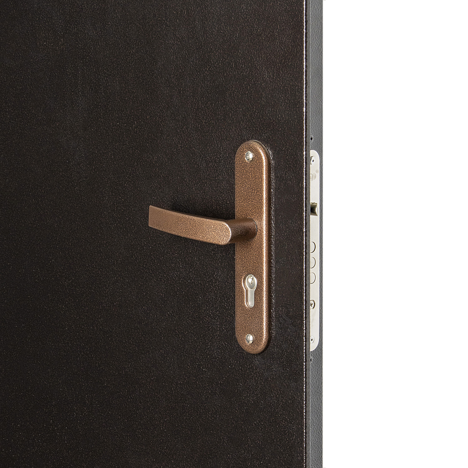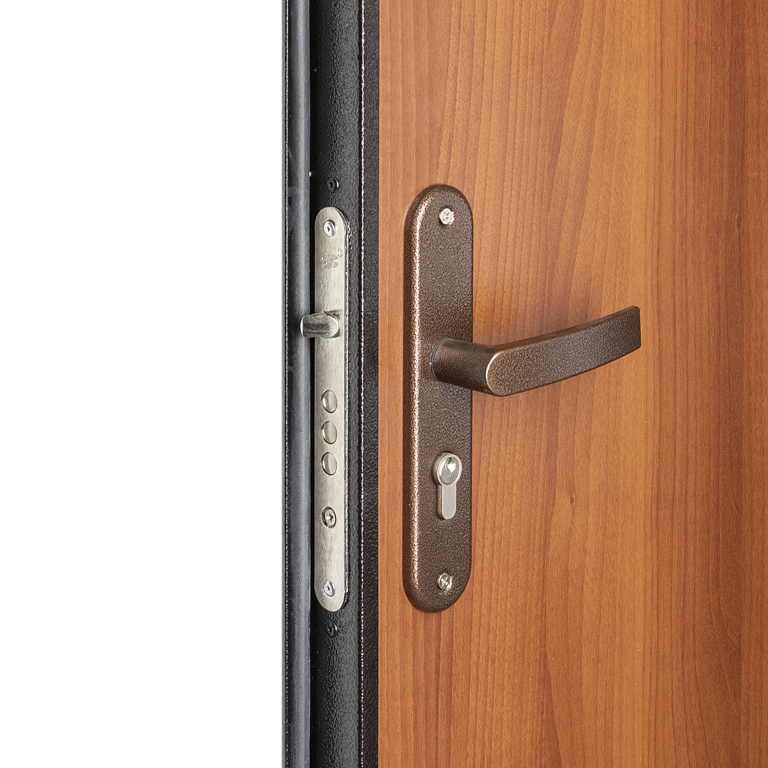 Дверное полотно, коробка с наличником, петли - 2 шт., противосъемные ригели - 3 шт., глазок, основно