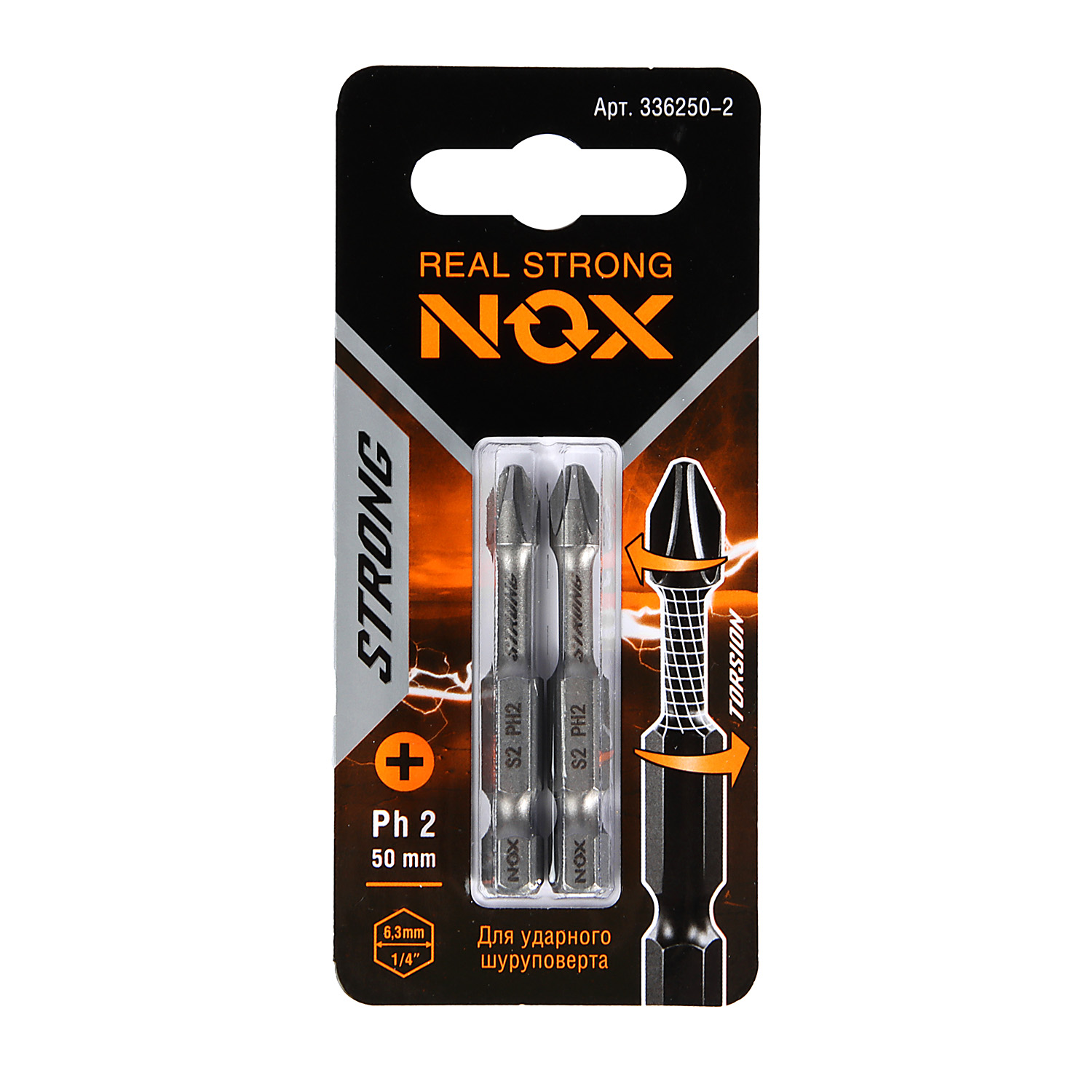 Бита крестовая PH2х 50мм (2шт) торсионная S2 хвостовик1/4"Е STRONG арт.336250-2 NOX *10/50/100