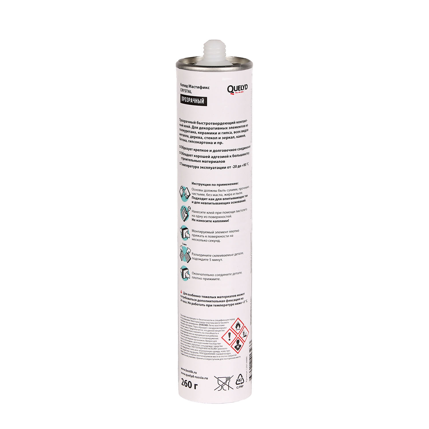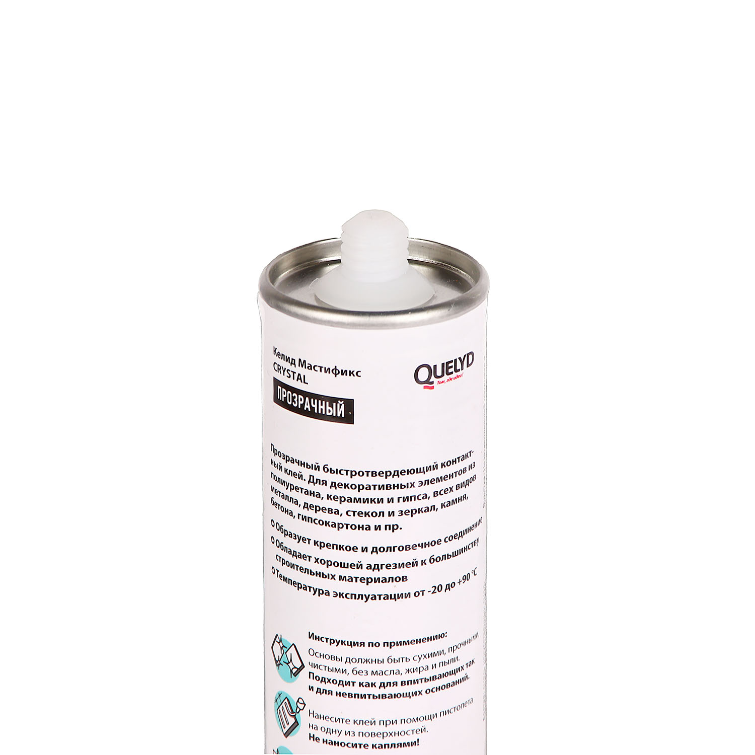 Жидкие гвозди Quelyd Мастификс CRYSTAL — однокомпонентный клей на основе искусственных смол, высыхающий за счет физического испарения растворителей. Разработан для универсального применения, может заменить большинство монтажных клеев. Создает сверхпрочное клеевое соединение.