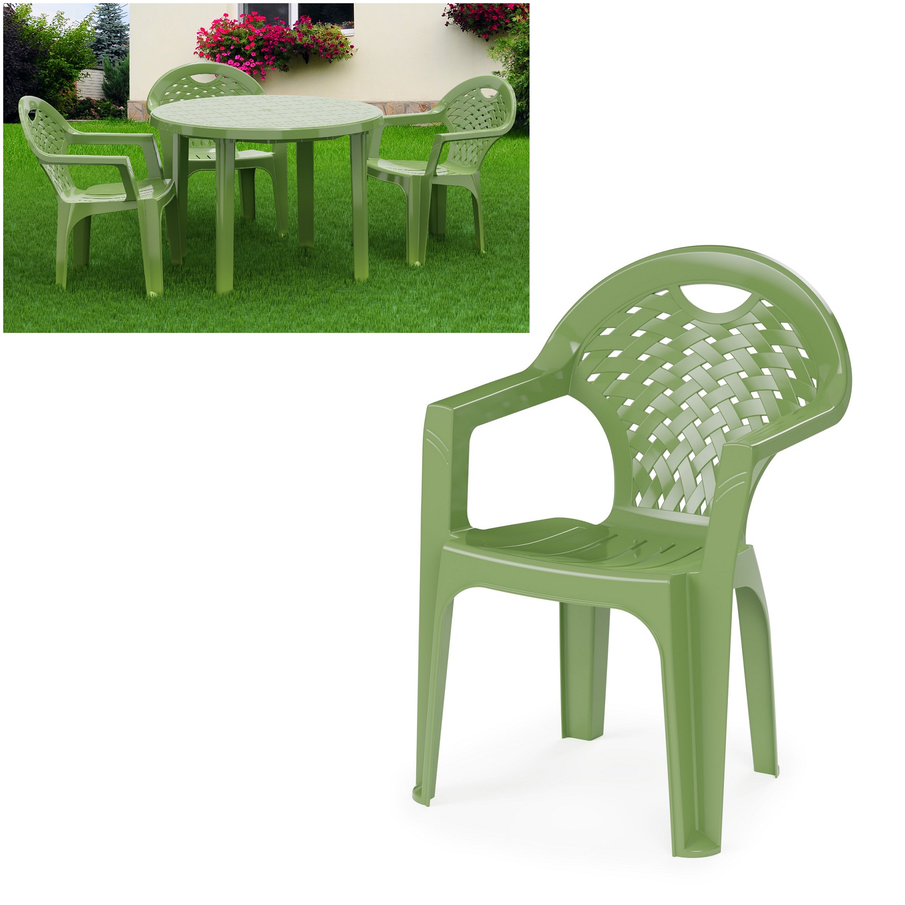 Зеленый цвет кресла-стула придает ему свежую и свежую атмосферу, обогащая ваше пространство ярким акцентом. Стильный и современный, этот кресло-стул привнесет нотку яркости и эстетики в ваш дом или сад.