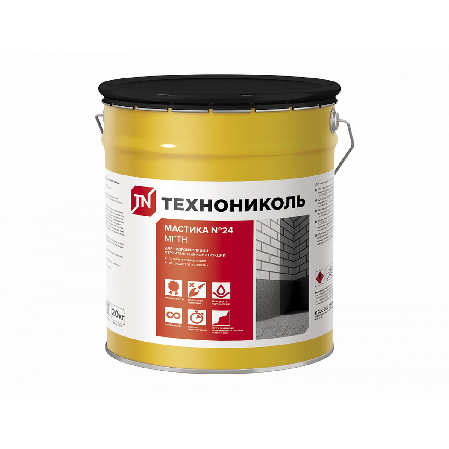 Мастика гидроизоляционная ТехноНиколь № 24 (МГТН) 20 кг — полностью готовый к применению материал на основе нефтяного битума. Предназначена для защиты от влаги фундаментов, подвалов, свай и других заглубленных в почву конструкций. Создает высокопрочное водонепроницаемое покрытие без стыков, что способствует продлению срока службы конструкции. Один слой высыхает за 12-24 часа — время зависит от толщины и температуры внешней среды.
