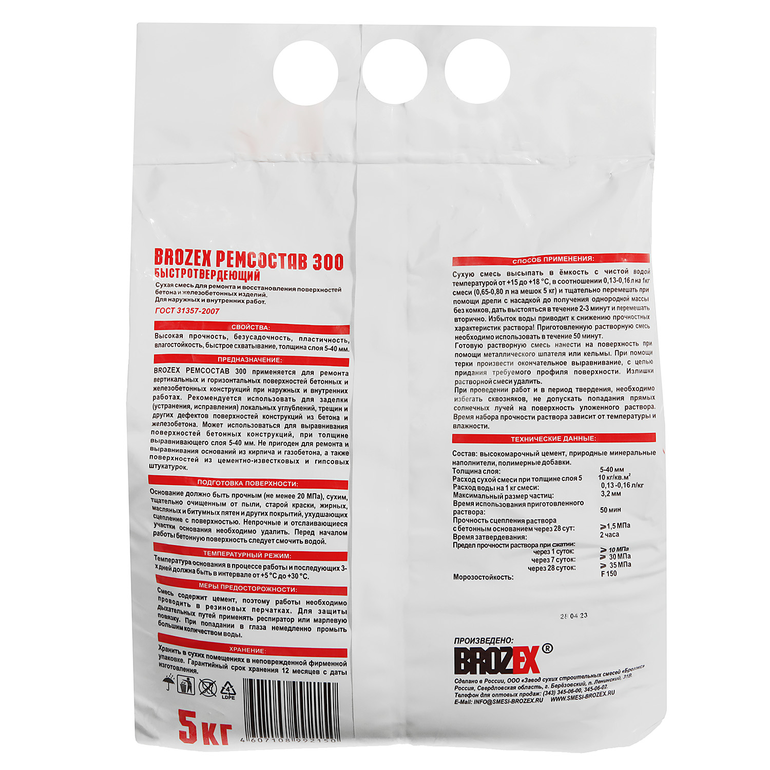 Ремсостав 300 быстротвердеющий BROZEX предназначен для ремонта вертикальных и горизонтальных поверхностей бетонных и железобетонных конструкций при наружных, внутренних работах. Рекомендуется использовать для заделки (устранения, исправления) локальных углублений, трещин и других дефектов поверхностей. Также используется для заполнения швов в стенах из панелей и крупных бетонных блоков.