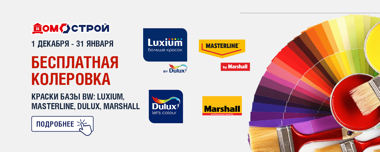С 1 декабря 2025 по 31 января 2026 при покупке краски брендов Luxium, Masterline, Dulux, Marshall (база BW) - услуга колеровки предоставляется бесплатно. Технология компьютерной колеровки поможет вам воплотить любую дизайнерскую задумку. Просто выберите идеальный оттенок!